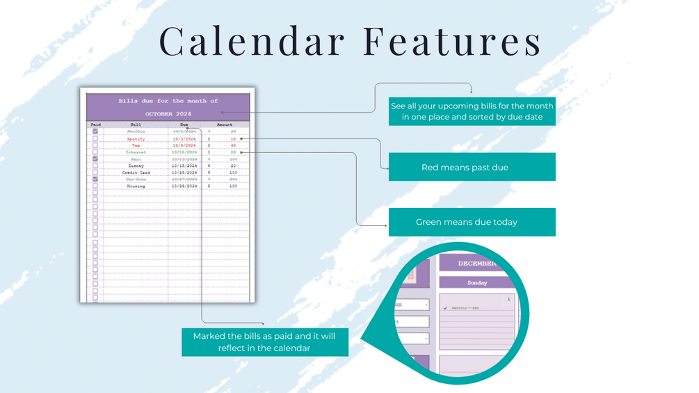 Never miss a payment again! Our automatic calendar displays all your upcoming bills, so you can plan and stay stress-free. Use on any month and year and see the days of the month update. You have the option to start the calendar on either Monday or Sunday.