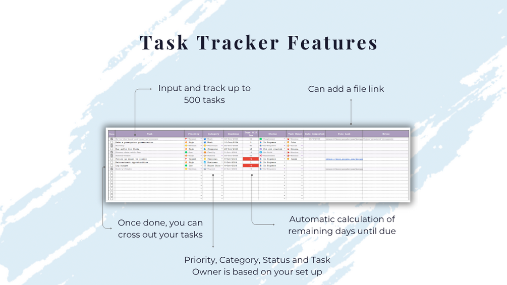 Task Tracker: Track up to 500 tasks. Add and categorize tasks with columns for task names, priority levels, due dates, statuses, file link, task owner and notes.